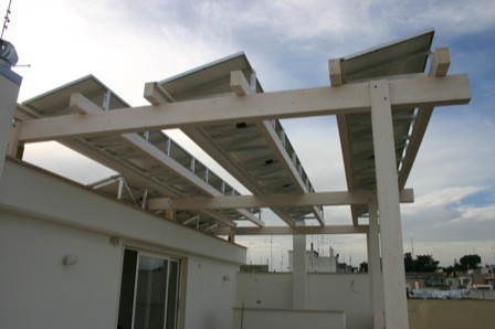 L'impianto  fotovoltaico è stato    realizzato su di una pergola  presso    un'abitazione sita in Bari. I moduli  sono esposti a SUD-OVEST ed hanno  un'inclinazione di  circa 6°  sull'orizzontale.     Potenza impianto: 3,45 Moduli: n. 15 della potenza di 230 Wp Tipologia: silicio policristallino Inverter: n. 1 da 3 kW Entrata in esercizio: 18/02/2011